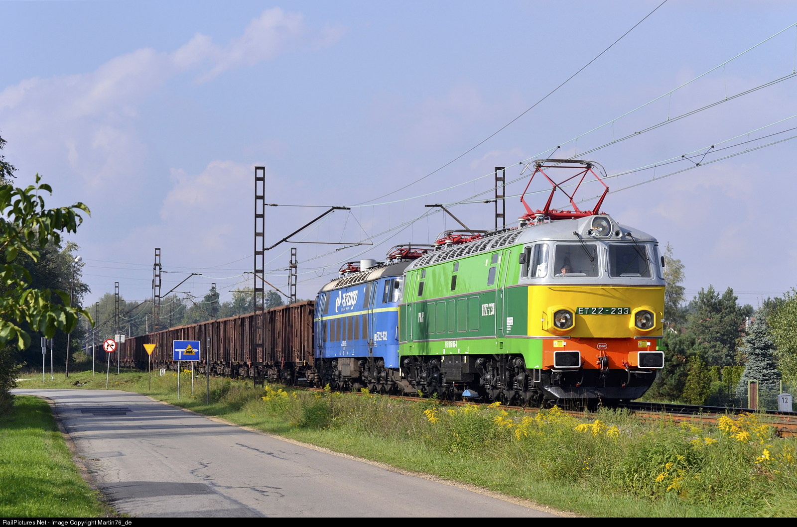 | The electric locomotive ET22-233 hauling a of ET22-1132 and freight train from Łazy to Zabrzeg Czarnolesie. The first locomotive has a retro painting, the second the company colors of PKP Cargo.