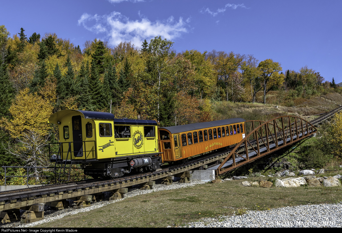 New Hampshire's colorful Cog Railway. Fall colors provide the backdrop as the Mt. Washington Cog Railway's Diesel-Hydraulic Locomotive M4 "Agiocochook" takes the B-section of the 1PM excursion up the hill to the summit of the Northeast's highest peak. Since 2009, The Cog has been primarily a diesel operation, with the exception of the very first and very last trips of the day. And like the railroad's coach fleet, the new locomotives are painted a variety of bright colors, resulting in some very colorful trains. On this particular day, with the oranges and yellows in the trees, I found this combination particularly appropriate for the season.