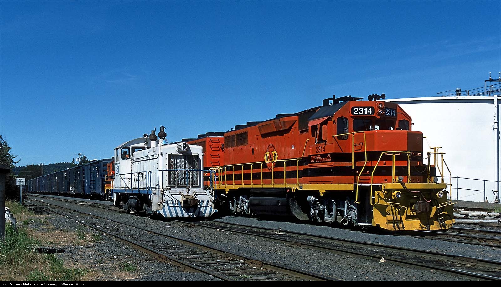 | Willamette & Pacific's McMinnville Switcher arrives at Newberg with empties for the pulp mill. The Smurfit switch engine had brought loads up from the mill, and will return with the empty cars WPRR is delivering. |