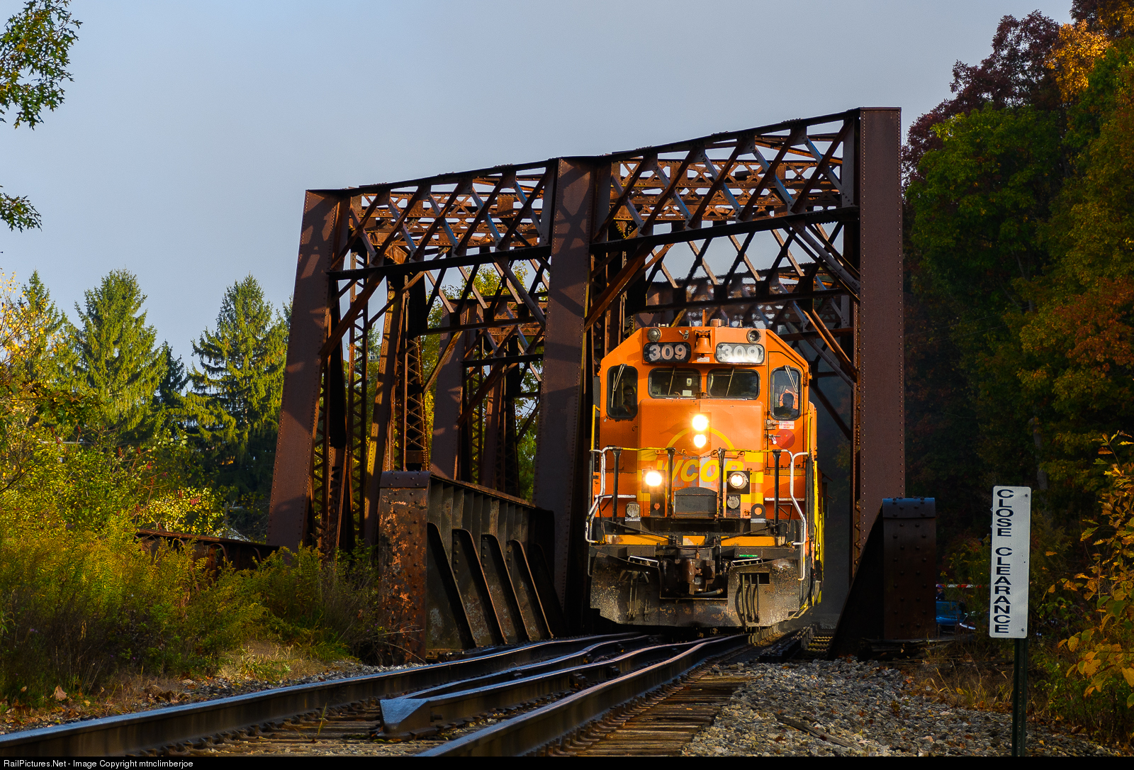 | The heavy morning fog has just lifted to allow some slivers of morning sun to shine through on the Buffalo & Pittsburgh's SIRI as WCOR 309 leads the train through Carrollton, New York, crossing over the WNYP on a truss and girder bridge. |