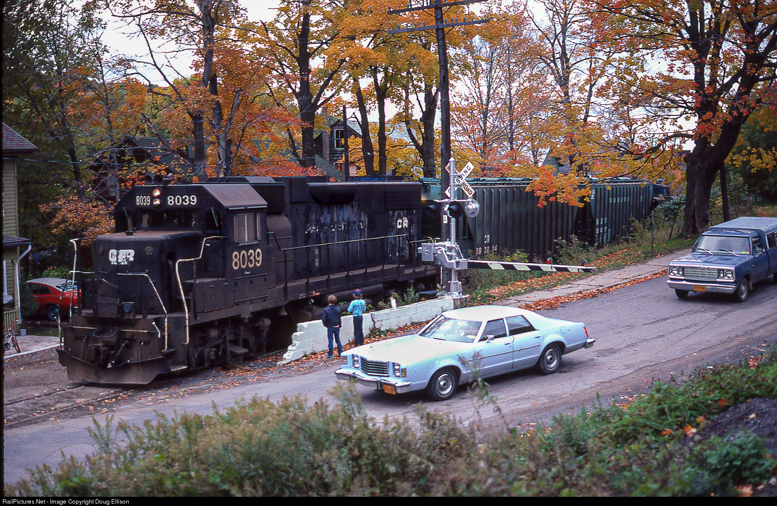 Conrail 8039, with the old Penn Central paint clearly showing through, leads the WVUT-52 across the Main Street Crossing in Clayville, NY.