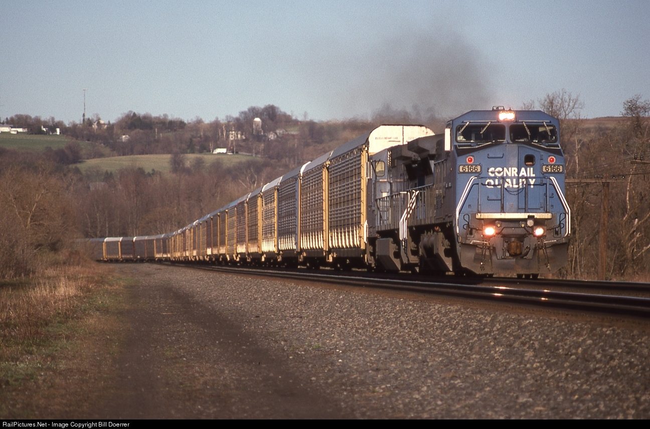 Conrail C40-8W number 6166 leads a westbound autorack train near milepost 220 a few miles east of Herkimer, NY.