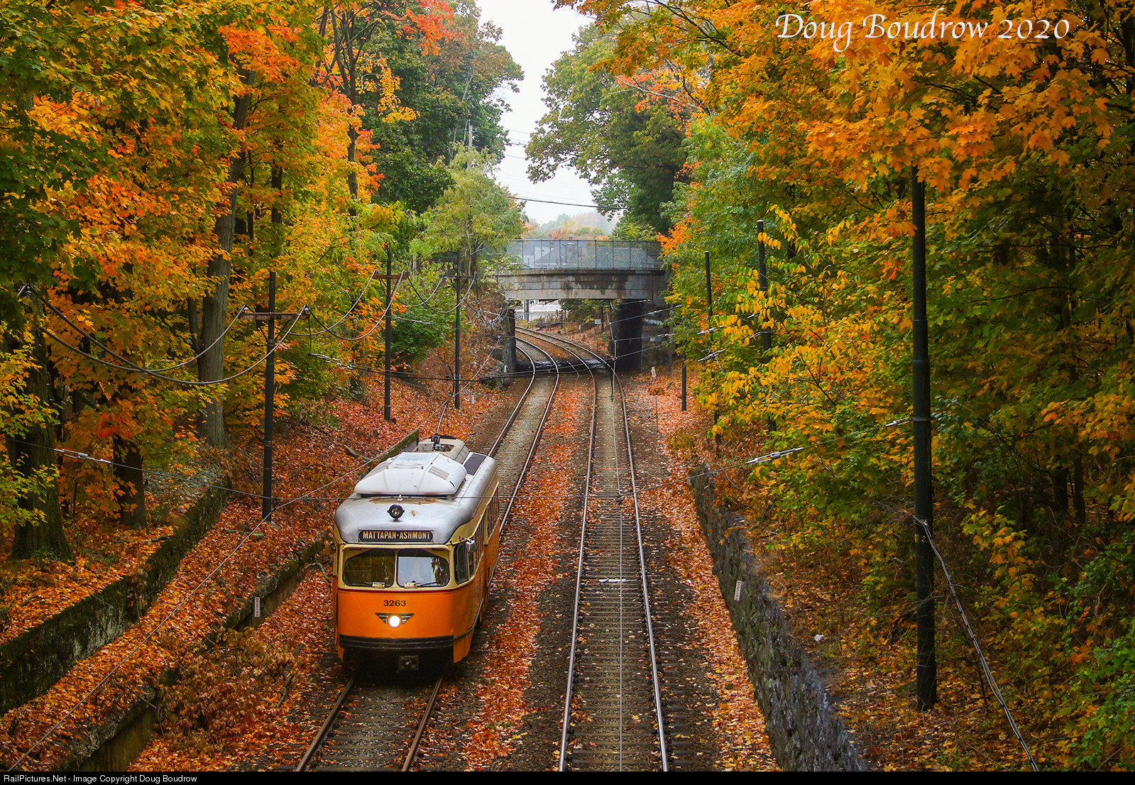 An Ashmont-Mattapan High-Speed Line trolley is seen scooting through Cedar Grove among peak fall foliage. The post World War 2 Pullman-Standard trolleys have been in constant revenue in Boston since they were built.