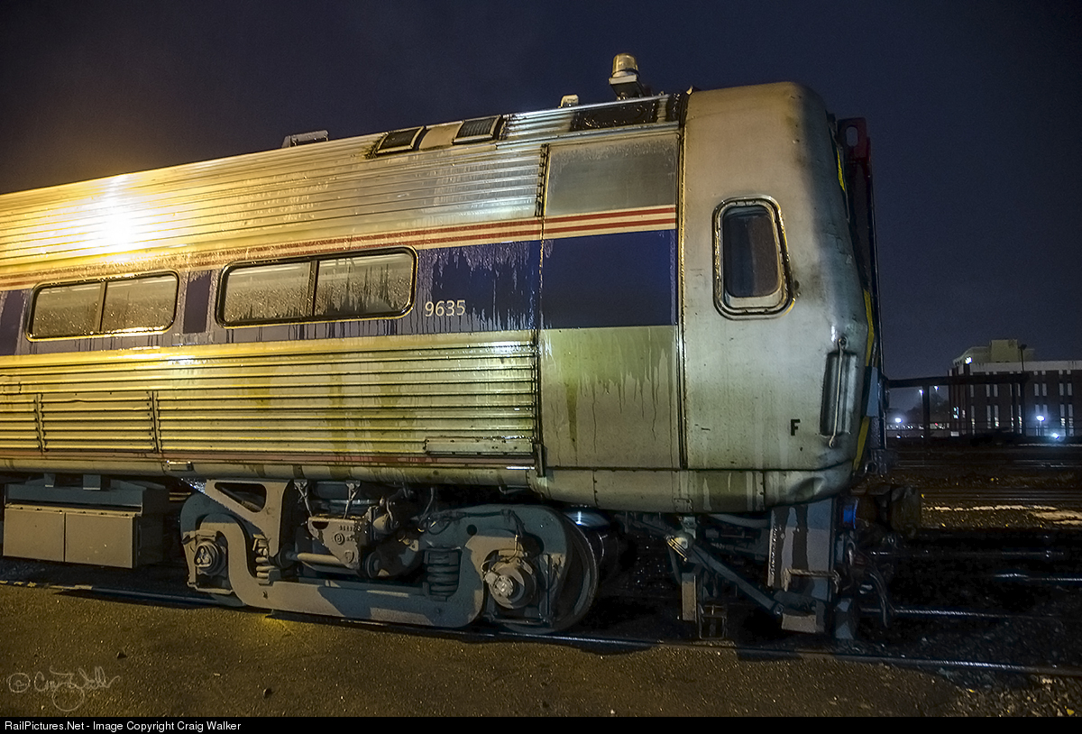While a steady rain falls, a pair of Amtrak New Haven-Springfield Shuttles are tied down because the day's rain has washed out the mainline not far south of Springfield. Amtrak cab car 9635 was originally Penn Central Railroad Metroliner car 823, built by Budd in the late 1960s. By the late 1980s, several of these Metroliner cars were converted to unpowered cab cars for Amtrak San Diegans operating between Los Angeles and San Diego. Amtrak 9635 was one of these cars, which had their pantographs, traction motors and other equipment needed for them to operate as power cars removed. The scenery it traverses in Connecticut and Massachusetts is a little different than skirting the Pacific Ocean in southern California, and the weather is certainly harsher in the northeast, but fifty-some years on, these cars continue to earn their keep. To see this same cab car in California in 1992, 27 years earlier to the day, click HERE. (Springfield, Massachusetts – January 24, 2019)