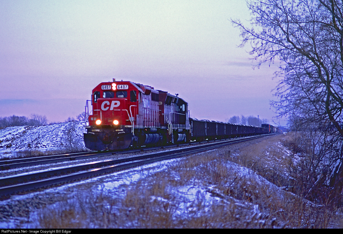SOO SD40A no. 6407, originally built for ICG in 1970, leads a GP40X west out of Brookfield, WI at Springdale Rd. at dusk. A light dusting of snow covers the ground, somewhat surprising for late February in Wisconsin.