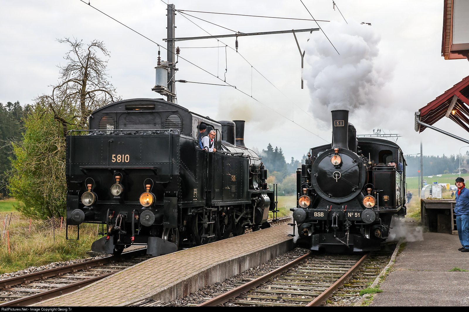 | Meeting in Häusernmoos on the Emmental railway. Steamlocomotives 2-6-2 T Eb 3/5 # 5810 "Habersack" and 2-6-0 T Ed 3/4 # 51 former Bern-Scharzenburg-Bahn (BSB), both owned and operated by the Dampfbahn Bern and based in Konolfingen. |