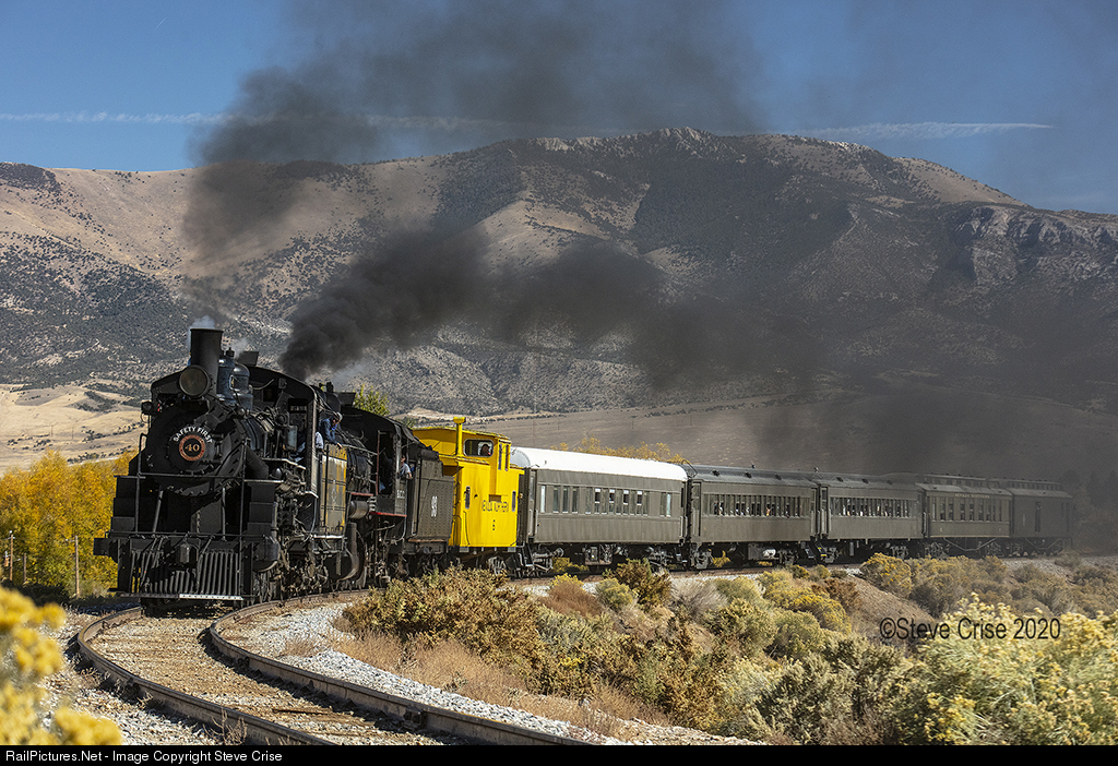 | October 17, 2020. Last run of Nevada Northern Railway's Locomotive # 40 before she is taken out of service for her 1472 rebuild. Locomotive # 40 and # 93 run up the grade approaching Lackawanna crossing. Incidentally, this is the longest passenger train in recent memory and # 40 needs help from # 93 on the steep grades up to Ruth. The rebuild should take about 2 years. Steve Crise Photo. (File# NNRY 02838036)