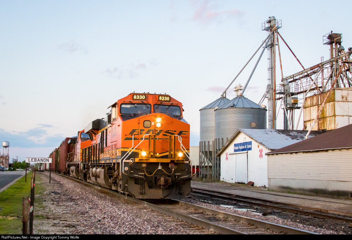 A pair of BNSF GE products are on the head end of 6,332ft long BNSF train G-HAYFRS3-24A. The 95 cars and 13,271 tons of loaded cottonseed out of Hayti Missouri bound for Fresno California are seen just cresting the grade in Lebanon Missouri. The train is passing the elevators of Noble Hudson & Sons, the town's Purina feed distributor.