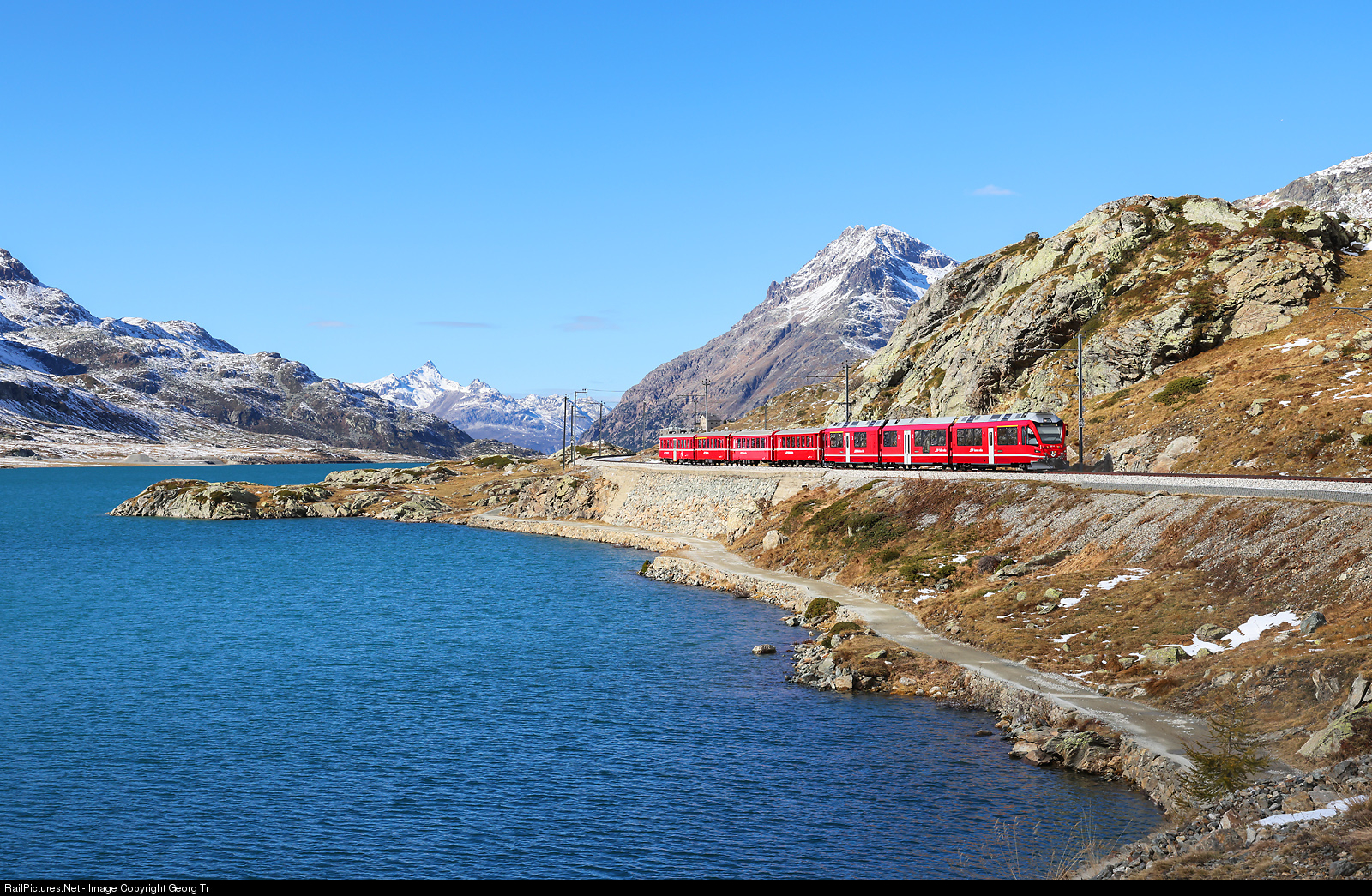 | "Allegra" railcar ABe 8/12 # 3514 of the Rhaetian Railway is pulling regional train 4637 from St.Moritz to Tirano along the Lago Bianco (White Lake reservoir) on the Bernina pass, about 2250 meter a.s.l. |