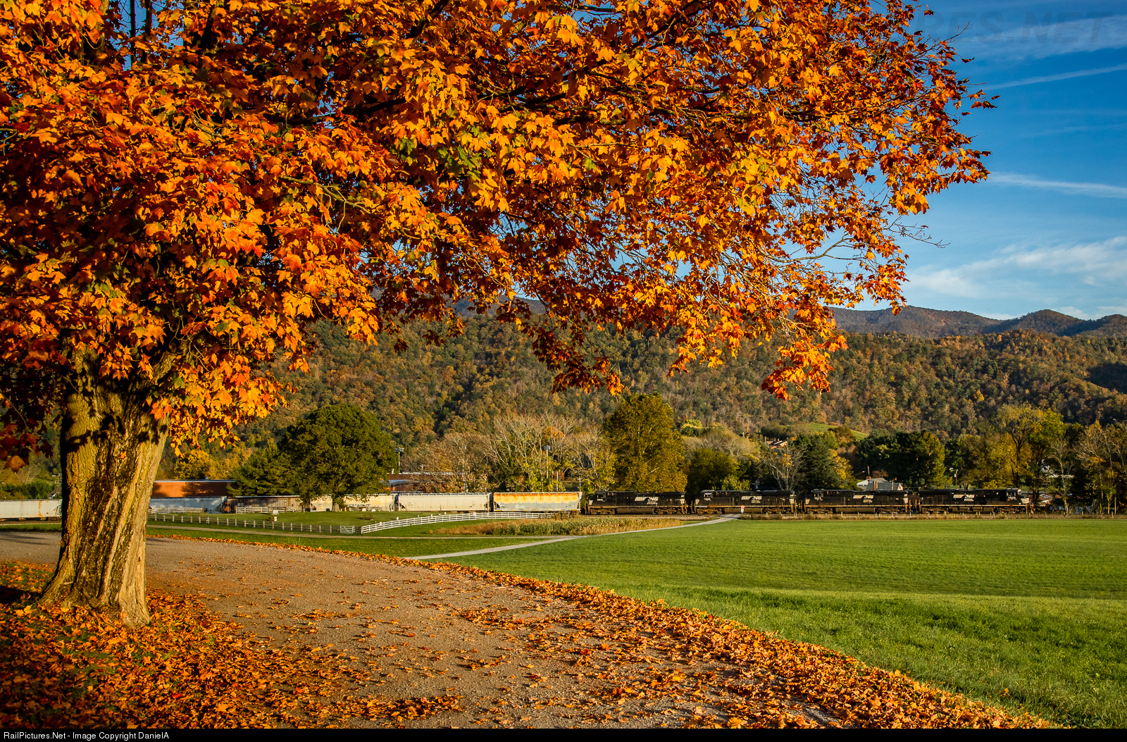 Framed by a vibrant orange tree, NS 195 thunders up grade in Shawsville in some great late evening sun.