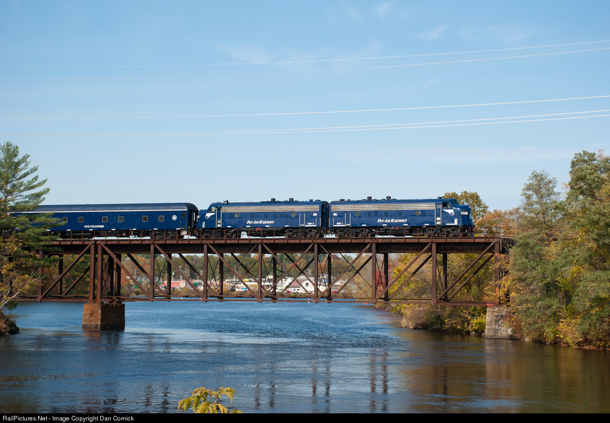 On a sunny mid late morning in mid October Pan Am's OCS crosses the Androscoggin River from Auburn into Lewiston Maine as it heads back to its home in Waterville.