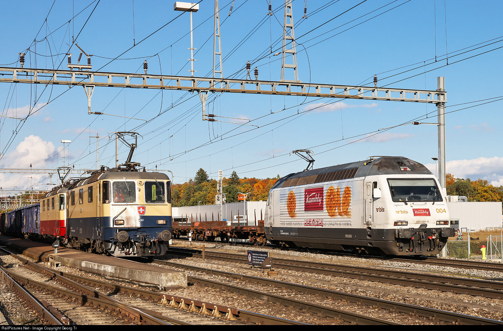 | Re 465 # 004 of the BLS in the KAMBLY paint scheme is pulling the empty aluminium train 48652 from Singen (Hohentwiel) via Schaffhausen-Bülach-Regensdorf-Brugg-Olten VL-Hauenstein-Basel to Woippy, through Hüntwangen-Wil. On the left sugar beet train to Islikon with Re 421 # 387 and # 393 of the IRSI, running for TR Transrail. |