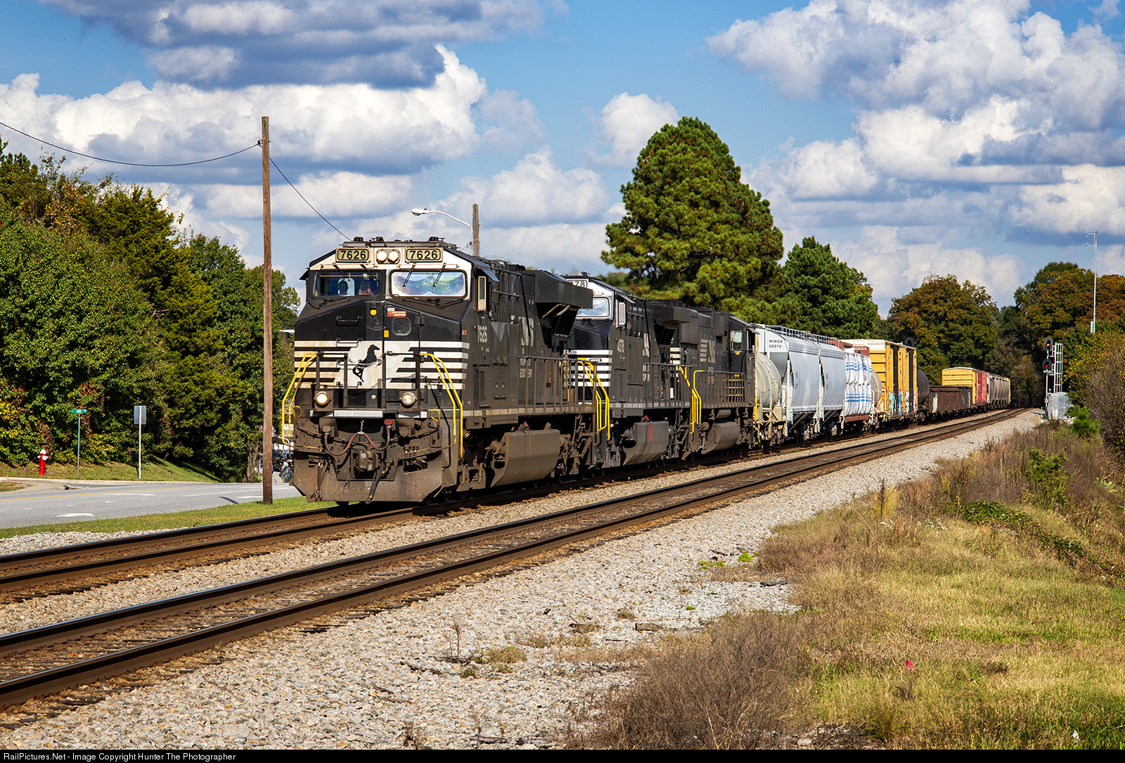 | On a partly cloudy October 24, 2020, Norfolk Southern manifest train 134 cruises through Thomasville, NC on its way south. |