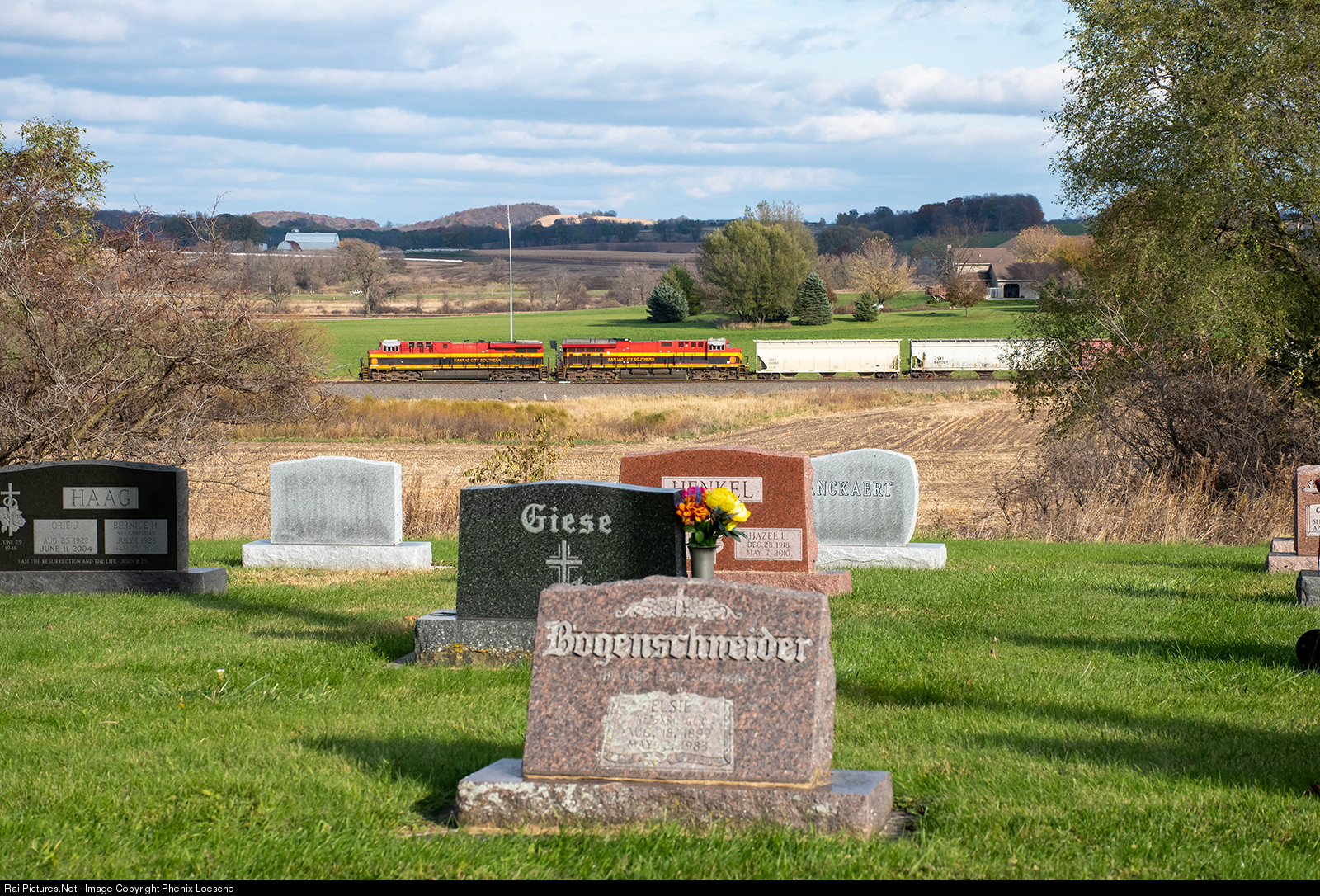 | A pair of KCS GEVo's lead CN train G887 past a cemetery near Theresa, WI. G887 has a train of 102 empty grain cars for several grain elevators in northeastern Wisconsin |