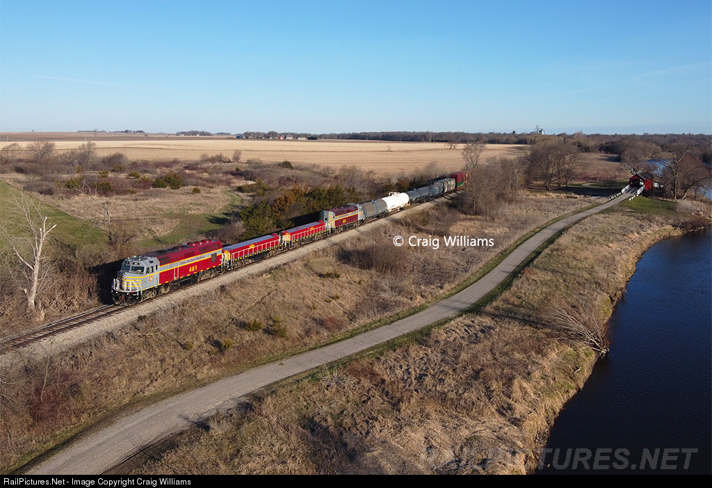 The Iowa Northern's North Crew slowly roll south on the Manly Sub outside of Rock Falls. The crew will stop and do work at Nora Springs with the CP here in a few miles. The rear car is hiding, but it is a 5-packers full of the new business IANR got beginning of 2020 that is going to the Butler Logistic Park from the UP at Manly. The Wilkinson Pioneer Park on the right was closed due to the virus, but a cool old covered bridge sits along the Shell Rock River. This is bridge #2 since the original was built in 1969, modeled after the covered bridges in Madison County near Winterset, IA. Too bad trees are getting too bad to get anything decent with the trains.