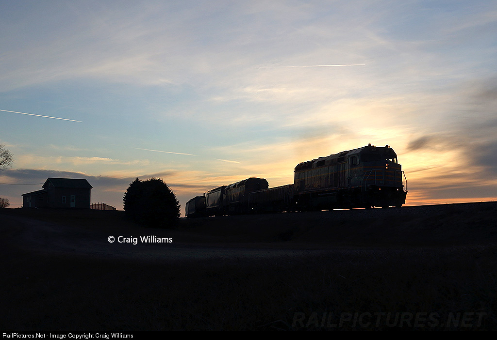 | With a 3pm start time at Waterloo and the winter light, the Oelwein Job treks north at sunset. The train is a couple miles south of Dunkerton as they pass this farmstead with a small 4 car train. This job works all the local customers on this Oelwein Sub that was once old Chicago Great Western Mainline from Oelwein to KC. This trackage was handed down to the UP thru mergers and now has been sold or leased and the Iowa Northern operates it from Waterloo to Oelwein. |