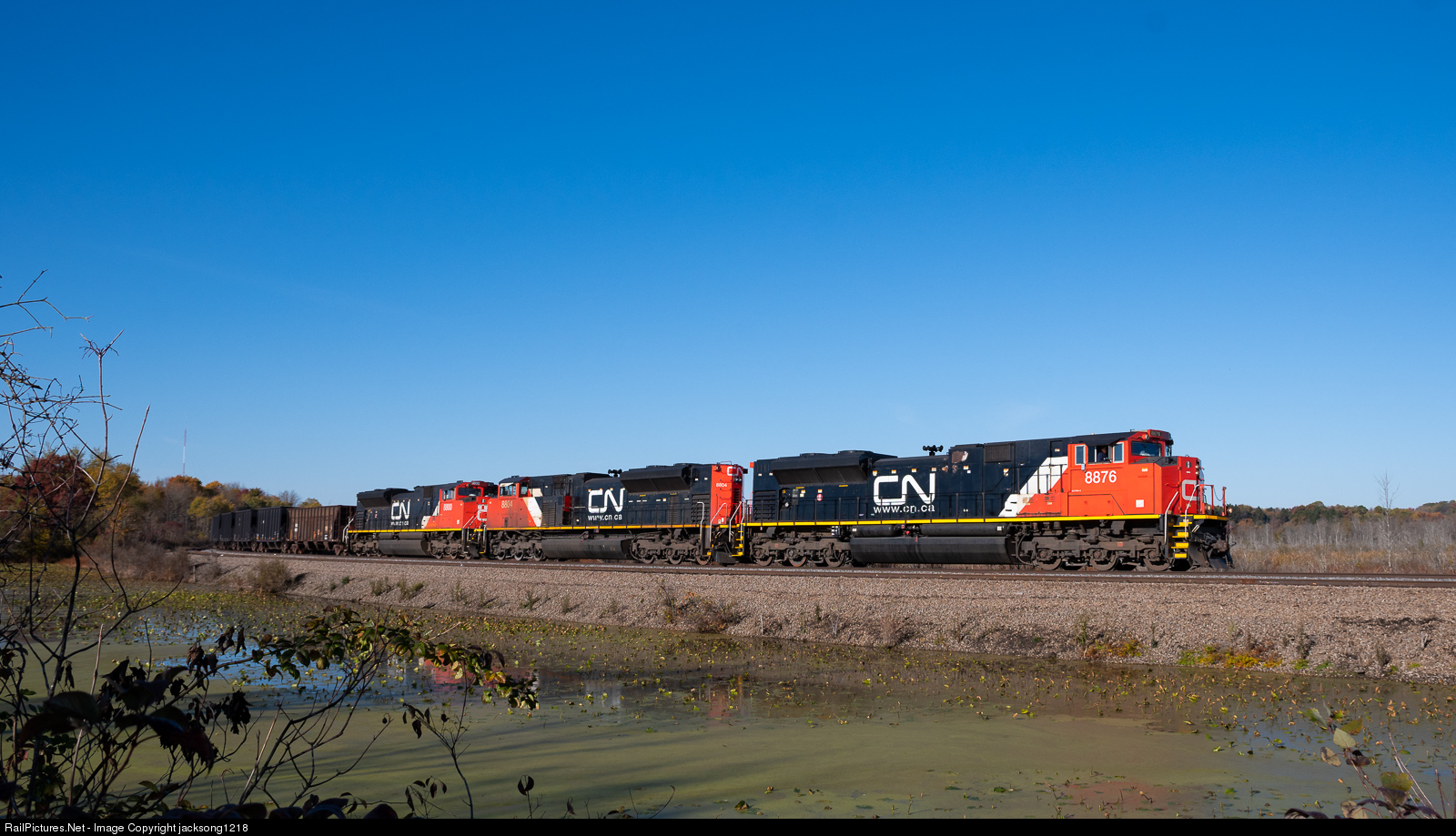 A trio of Canadian National EMD SD70M-2s leads the Bessemer & Lake Erie's northbound empty ore train through the old Meadville Junction wye in the early morning hours.