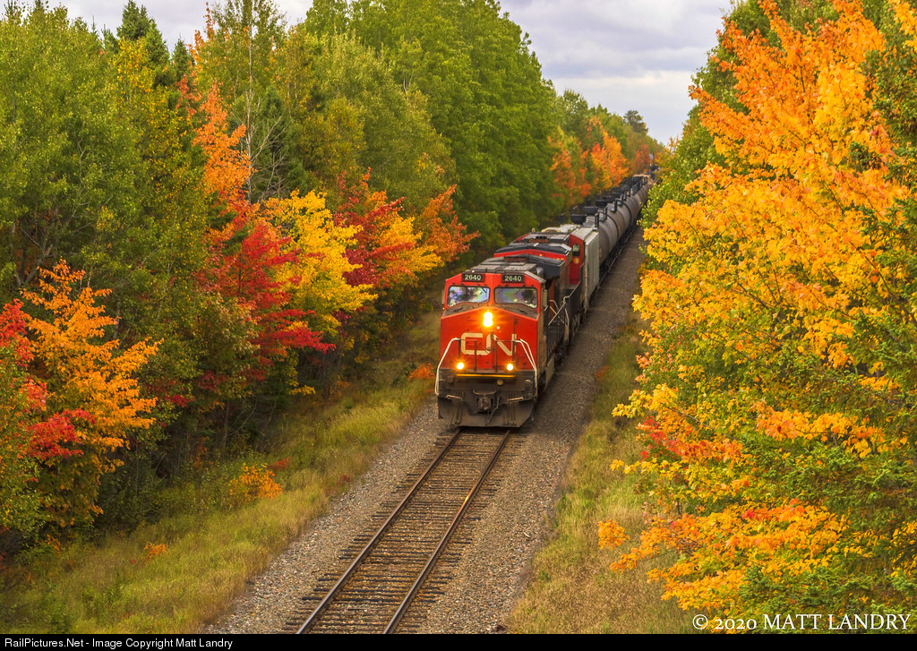 CN 2640 is westbound along some colorful Fall foliage at Petitcodiac, New Brunswick. The colors began changing a week or so early than in normal years.