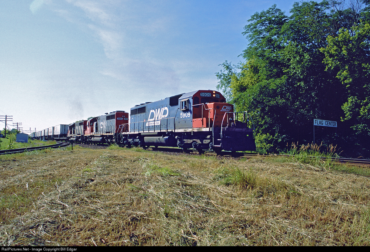 | DWP 5909 rushes west with intermodal freight on a CN haulage train on BN's mainline from Chicago to the Twin Ciites at Flag Center, IL. This agreement was put in place after the 1985 acquisition of Milwaukee Road by Soo Line. It ended when CN moved the haulage to Wisconsin Central, then acquired WC in 2001. DWP 5909 came from GTW and was built in 1969. |
