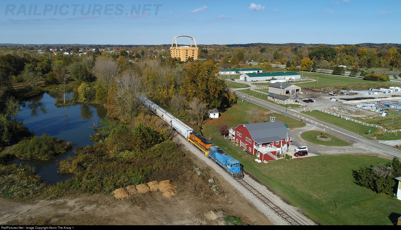 | ZVNK begins its return trip to Zanesville with a pair of non-matching -7s as the train departs Newark, OH and passes the worlds largest picnic basket. |