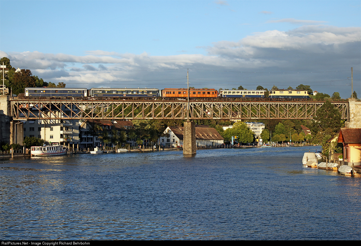 Re 421 387 is crossing the Rhine bridge with a private charter train. Behind the locomotive is a passenger car rebuilt in 2012, two dining cars, one is a teakwood car, the second in livery of CIWLT, and a former international baggage car.