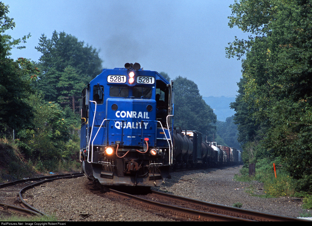 A former Conrail Quality GP38-2 leads an unusual consist on 18G. The consist (not visible) includes an NS C39-8 and CSX SD50. The train is approaching Prospect Ave on Conrail's Lehigh Line.