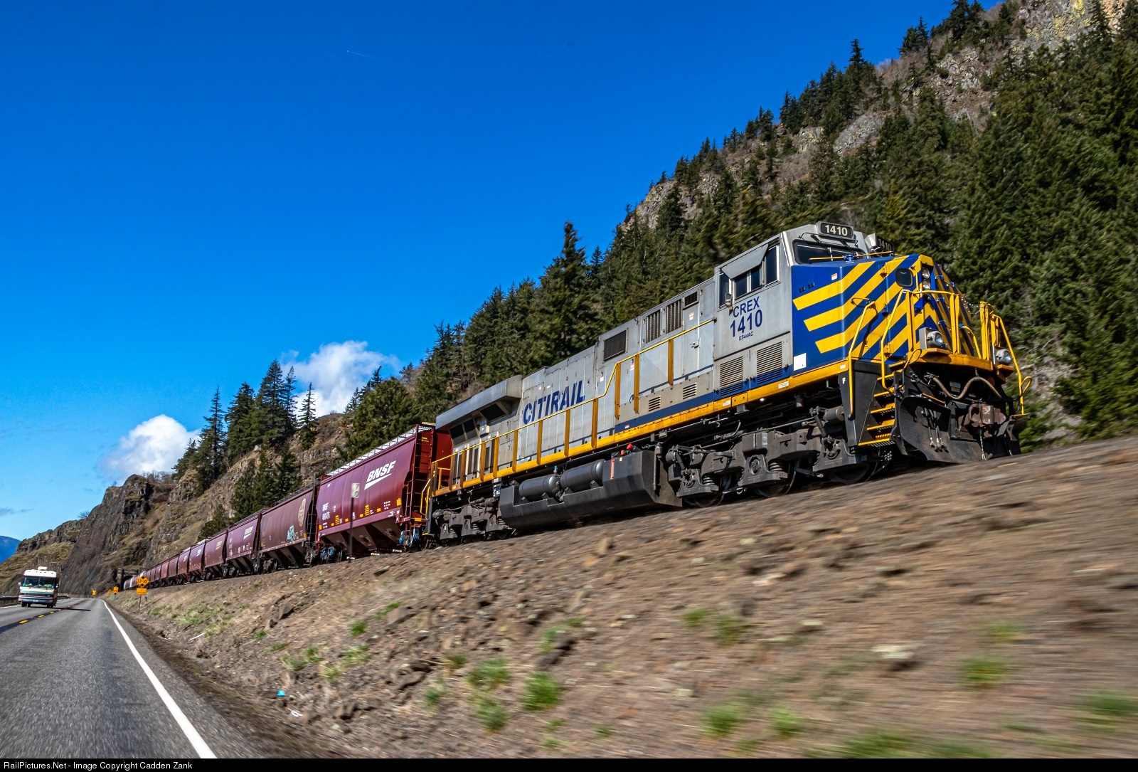 Taken just west of Hood, WA on Lewis and Clark Highway, CREX 1410, acting as a DPU, shoves the grain train westbound towards Vancouver. Along the former SP&S territory, the railroad follows the Columbia River throughout the Columbia River Gorge making for a wide variety of beautiful photo opportunities.