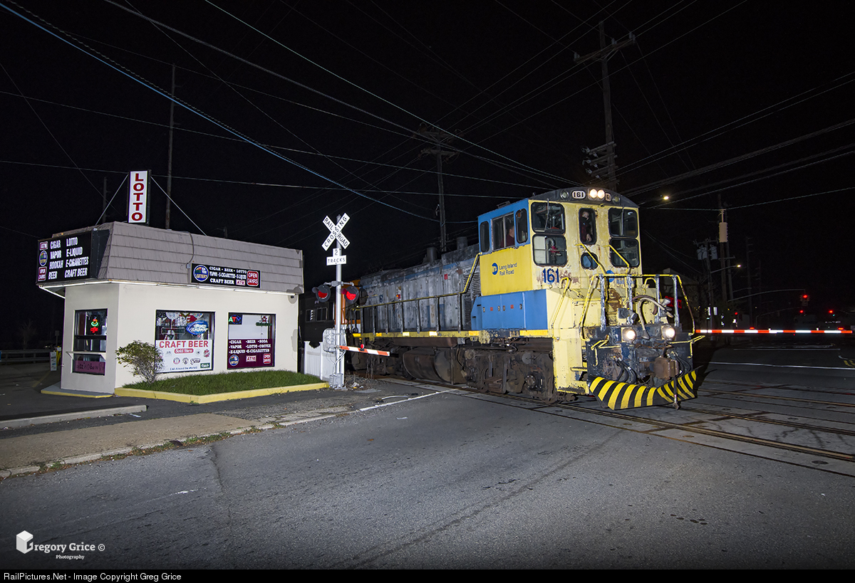 Long Island Rail Road's "LaserTrain" heads east past the In N Out Convenience Shop in Hewlett, NY on the Far Rockaway Branch.