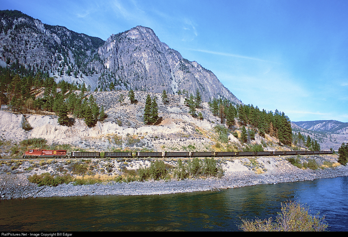 A CP coal train heads west on CN trackage along the Thompson River east of Lytton. Modern AC technology drastically reduced the quantity of locomotives that CP required to move these heavy coal trains west of Kamloops, BC to the Coast.