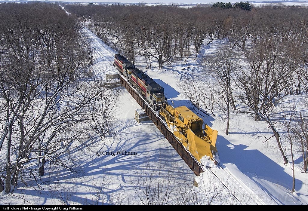 | Back in 2019 the Iowa Northern went out for the 3rd time in late February with their new Jordan Spreader. The 1st 2 times they did the Manly Sub around Nora Springs. Today's agenda was the Oelwein Sub from Dewar to Oelwein. They went to work at 4am at Bryant Yard in Waterloo and worked out to Oelwein by 2pm. Pushing drifts back on 19 miles of railroad helps track inspections, improves train movements, and has the railroad set up better for the next snow storm. Here the job slowly works north between Dunkerton and Fairbank as they cross the Wapsipinicon River in Bruggeman Park. |