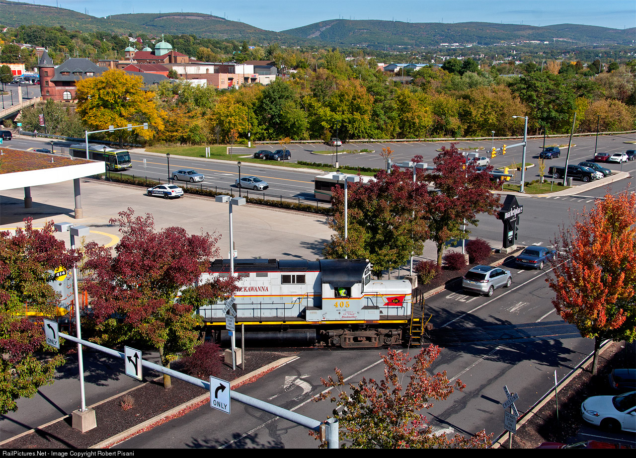Delaware Lackawanna BR-1 crosses the entrance to The Marketplace at Steamtown maill in Scranton. The train is heading up the Vine Street Branch from Bridge 60 to do some work at Green Ridge.