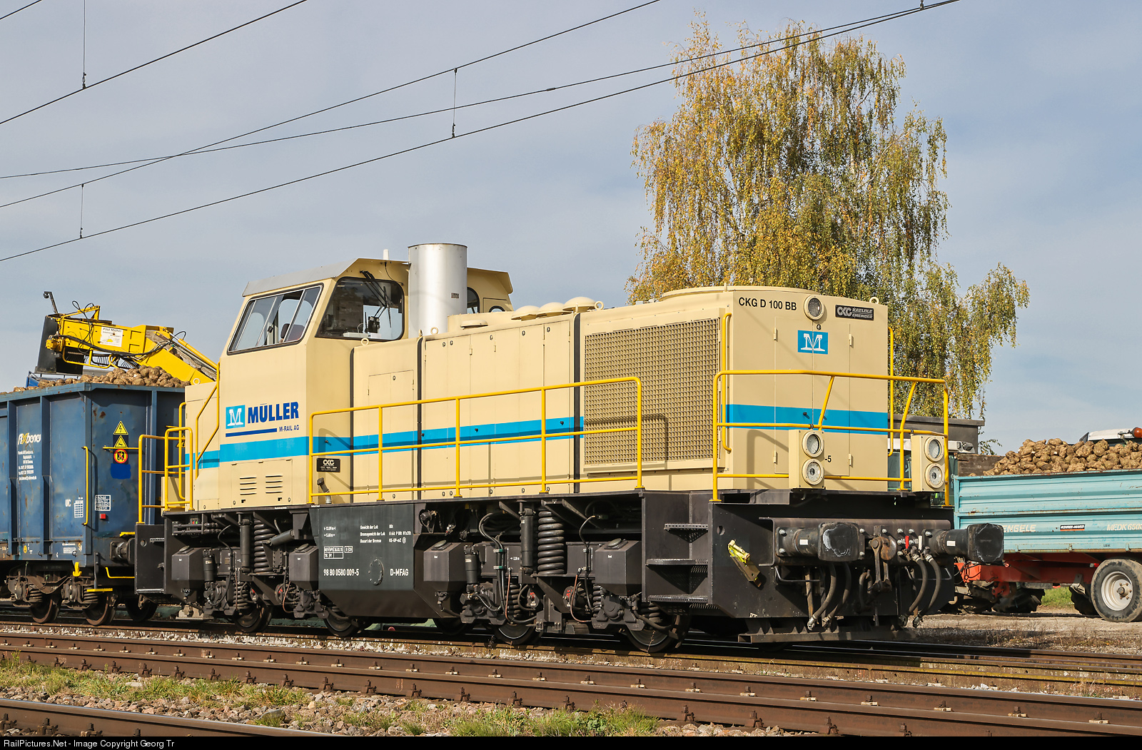 | 1320 kW diesellocomotive CKG D 100 BB 580 # 009 (D-MFAG 98 80 0580 009-5) of M-Rail AG (Müller Rail) in Oberaach, in operation for the sugar beet traffic of TR Transrail. The locomotive was built by Kaelble/Gmeinder in 1993 for the Verkehrsbetriebe Peine-Salzgitter GmbH (VPS) and sold to M-Rail in 2013. |