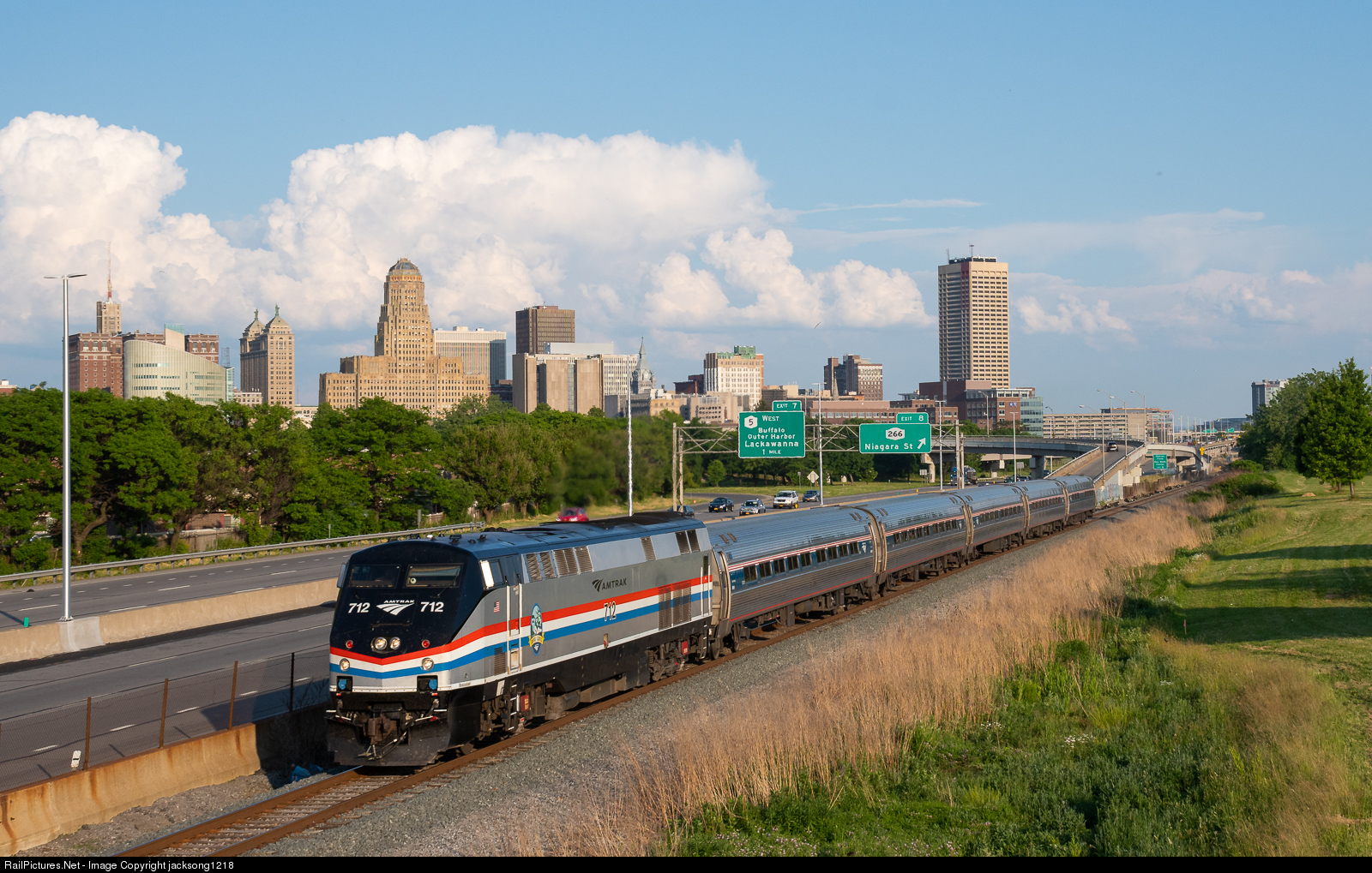 | After picking up passengers at Buffalo's Exchange Street station, Amtrak train 281 the "Empire Service" races north towards Niagara Falls with the Buffalo skyline in the background. |