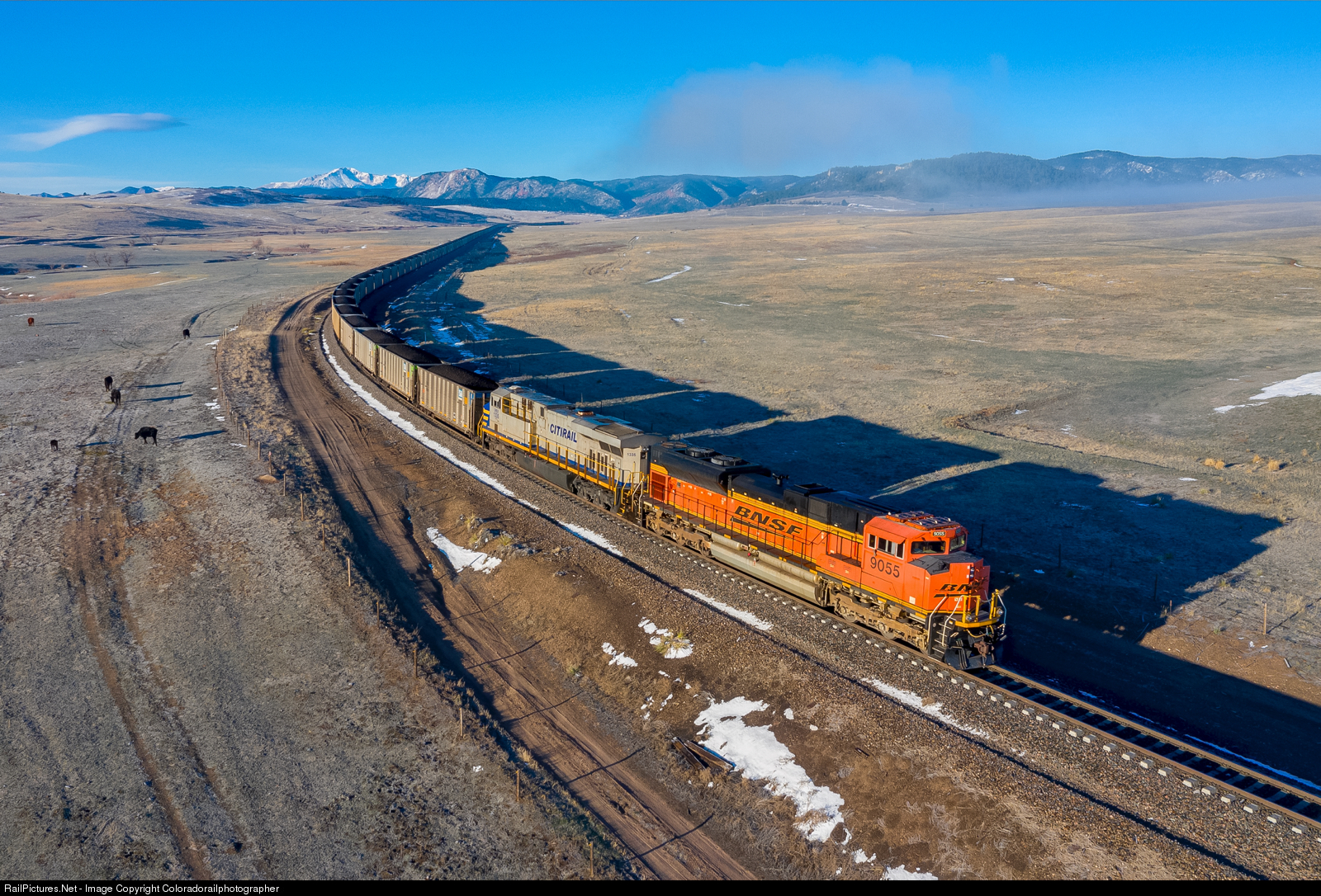 BNSF empty coal rolls northward at Greenland on a vibrant early Spring morning. In the valley fog and and other weather elements are lifting revealing freshly fallen snow on Pikes Peak. Shot on Mavic Pro 2. |