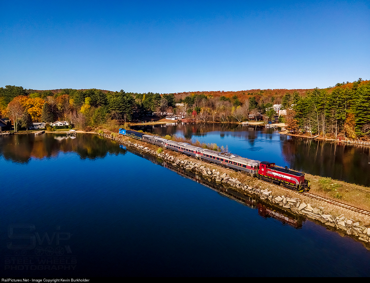 A pair of EMD end cab SWs on a charter with ex RDCs? Nope, not a model railroad but a charter operated by the Massachusetts Bay Railroad Enthusiasts group from Meredith to Lochmere, NH on the Plymouth & Lincoln Railroad's Winnipesaukee Scenic Railroad. PLLX SW1001 1590, Ex-CITX 1590, exx-NS 2107, exxx-Conrail 9418, nee-Reading 2618 was the south unit while the PLLX SW1000 1012, Ex-LTEX 1012, exx-BNSF 3631, nee-Burlington Northern 438, was the north unit, as seen rolling over the causeway between Chattle and Moulton Coves.