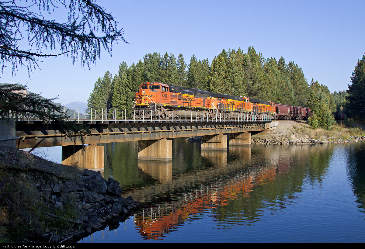 | BNSF 8517 rolls an eastbound grain empty across the bridge just west of Tuscor siding along the Clark Fork on Montana Rail Link several miles west of Trout Creek, MT. Nice to have an SD70ACe on the point of a grain train. |