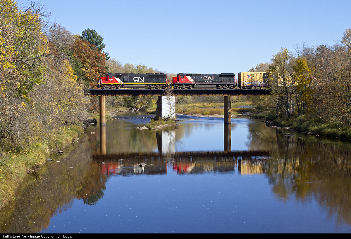 | CN 5487 heads its freight north into Sheldon, WI crossing the Jump River on the south end of town. The train will have a meet just north of town after having met southbound trains led by CN 3100 and CN 5450 at Atwood south of here a bit earlier. |