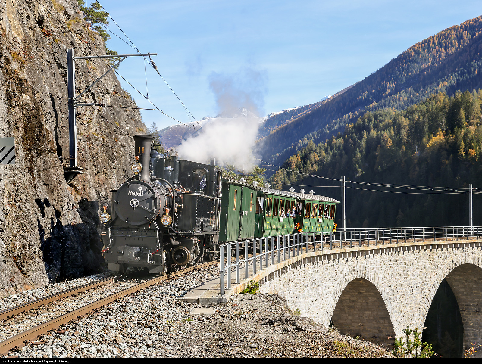 Steamtrain of the Rhaetian Railway from the 19th century just crossed the Landwasser viaduct between Filisur and Alvaneu. The locomotive G 3/4 # 11 "Heidi" is the newest vehicle, built by SLM in 1902. The baggage car F # 4004 was built in 1896 and was renovated by the "Club 1889" til 2015. Third class car C # 32 "Il Samedrin" was built in 1889 for the Landquart-Davos railway (LD) and renovated by the "Club 1889" in 1999 as C # 2012 and in 2019 refurbished as C # 32 of the LD (Landquart-Davos). The last car in the train was inaugurated this day, rebuilt by the "Club 1889", it is the third class car C # 66 built in 1897 by the Schweizerische Industriegesellschaft (SIG) in Neuhausen for the Rhaetian Railway. The narrow gauge railway "Landquart-Davos" (LD) changed the name to "Rhätische Bahn" in 1895, when the line from Landquart to Chur-Thusis was under construction already and further lines were planned, so this car is lettered as "RhB C # 66". The picture was shot from a non public photo spot, allowed by the conductor of the train.
