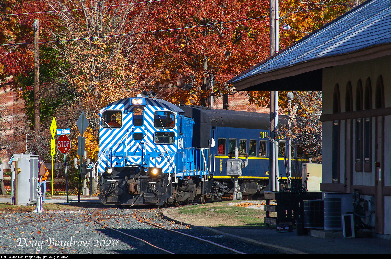 The Mass Bay Railroad Enthusiasts "Lochmere Limited" charter on the Winnipesaukee Scenic Railroad is seen passing arriving at the former Boston & Maine Laconia Depot. The SW 1001 was originally built for the Reading in 1973