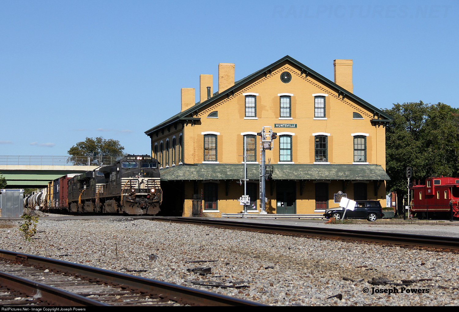 Norfolk Southern freight train 101 (Bulls Gap, Tennessee - Memphis, Tennessee) passes the old passenger station (now a museum) in downtown Huntsville, Alabama. The structure was completed in 1860 by the Memphis and Charleston Railroad. The building was also occupied by the offices of the Memphis and Charleston's Eastern Division headquarters.