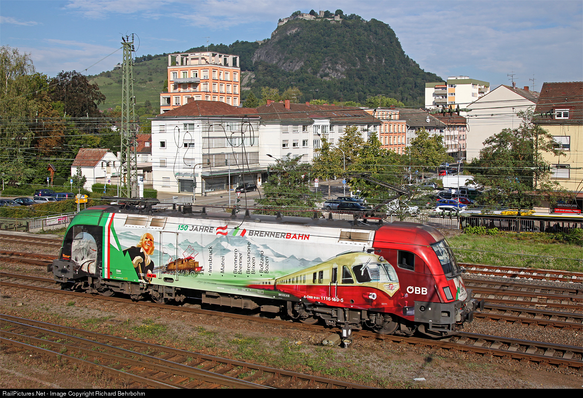| ÖBB 1116 159 has a publicity paint "150 Jahre Brennerbahn" ("150 years Brennerrailway" from Innsbruck/Austria to Bolzano/Italy). On this side are italian trains, on the other side are austrian ones., |