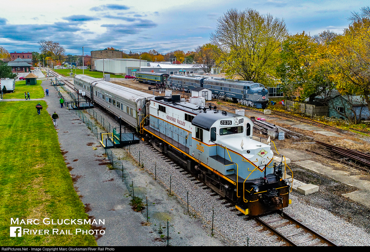 All Central. A passenger excursion on the Genesee Valley Transportation Co., Inc. owned Falls Road Railroad with FRR 2035 (née-New York Central Railroad 8035, Alco RS32) and a pair of former NYC "Empire State Express" coaches stops at the Medina Railroad Museum on Saturday, November 4, 2017. Those in attendance had an opportunity to tour the Medina Railroad Museum and its intricate HO layout. In the background, former New York Central Railroad E8s 4080 and 4068 sit quietly, presently inoperable.