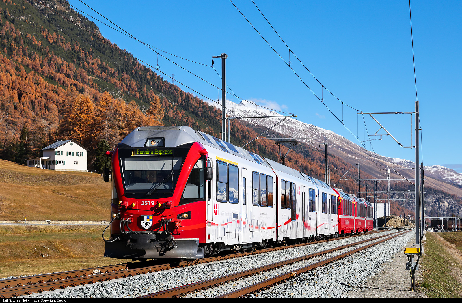 | "Allegra" railcar ABe 8/12 # 3512 of the Rhaetian Railway, in a publicity paint scheme for the ABB company, is pulling the PE 953 BERNINA EXPRESS from Chur via the Albula line to Pontresina, on the new built double track between Bever and Samedan. Because the Bernina line is closed between Pontresina and Poschiavo this week due to track works, the train has 3 panorama cars only and is circulating until Pontresina only. |