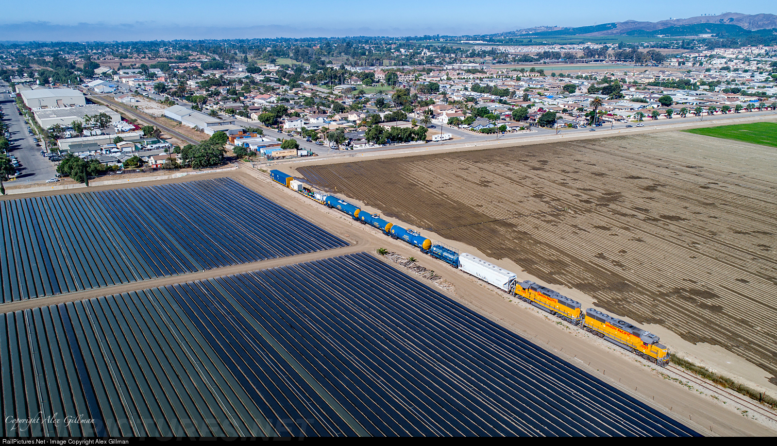 | Making the most of the 10 mph track speed on the Santa Paula Branch Line, UP 1007 leads this morning's LOF63 north with an interesting train of equipment to interchange with the Fillmore & Western Railway at Santa Paula. The CSX tank car safety training train, one of two or three that operate across the country, is coming to the Fillmore & Western Railway to be stored between uses. |