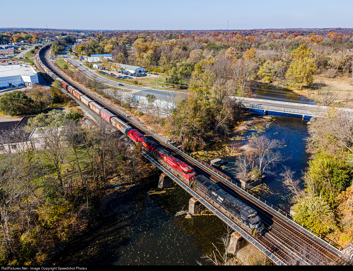 NS 3627 Leads two Canadian Pacific Units with a load of hoppers through Goshen Indiana over the Elkhart river