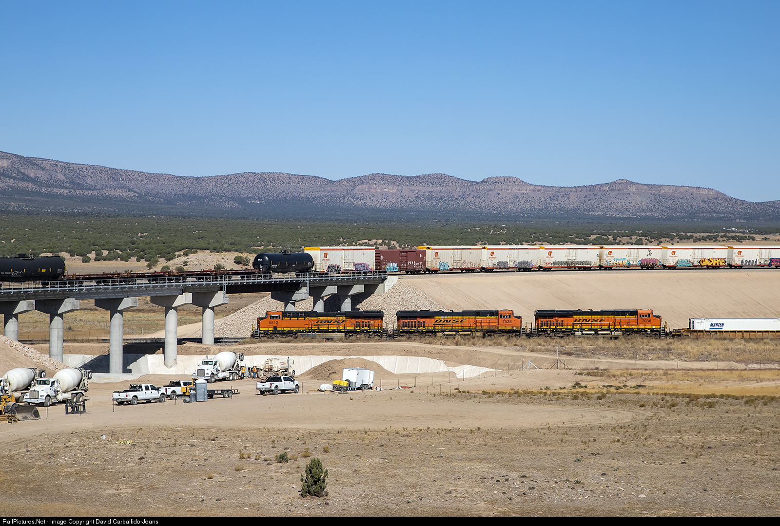 A westbound intermodal approaches the newly built Truxton Flyover, as an eastbound manifest take the flyover track on a windy, October morning. After 10 months of construction, the Truxton Flyover is designed to create an easier traffic flow from "right-hand running" to "left-hand running". From Barstow, CA to Truxton, AZ, eastbound trains use main track two (south track) because the grades of Ash Hill, Ibis, and Kingman Canyon. From Truxton to Belen, NM, eastbound trains run on main track one (north track) because of grade separation going over the Continental Divide in New Mexico. As a result of that, the fueling locations in Belen, NM are designed for "left-hand running". Prior to the flyover, trains would have to cross over from one track, to another, via dispatcher controlled switches. This resulted in trains waiting for one of another to clear the switches. With a flyover, it'll create a continuous traffic flow of trains going from main one to main two.