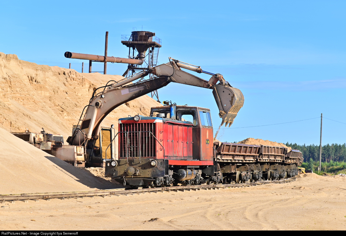 TU7 narrow gauge diesel engine with dump cars loading sand at the quarry of Tver building materials plant.