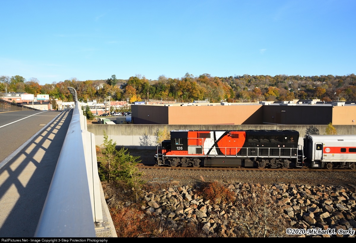 | Temperatures are in the upper 60s on this fall Thursday afternoon in November, as Brookville BL20GHM 126 heads a northbound train from Bridgeport to Waterbury, as it's about to pass under Bridge St. in Ansonia. The rebuilt locomotive was overhauled with a new Cummins prime mover and painted into the CTrail scheme by MotivePower Inc. (MPI) in Boise, ID. |