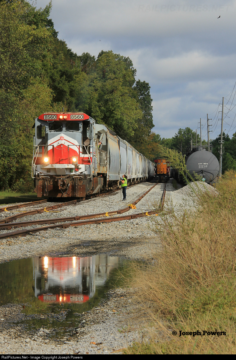 Just north of the Green Cove Road grade crossing in Huntsville, Alabama, crewmembers of the Huntsville and Madison County Railroad Authority are talking prior to using B39-8 8560 to switch cars just south of this location. The cars behind the locomotive are about to be moved by another locomotive on the opposite end of the train.