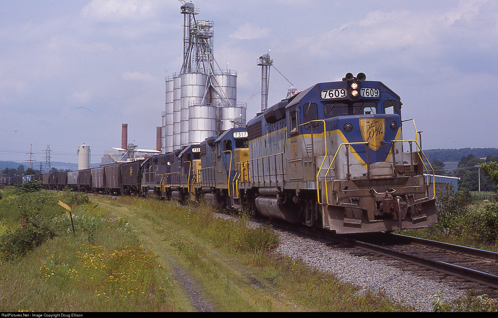 | A southbound D&H freight train, led by a GP39-2, passes by the now defunct Blue Seal feed Mill in Bainbridge, NY. |